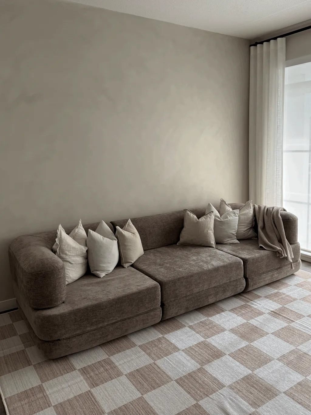 The design is pretty minimal and simple. It’s not trying to be some crazy statement piece, which I appreciate. Just looks clean and premium without being over the top. I went with charcoal grey and it goes with basically everything. My place has white walls and dark wood floors, and it fits right in. Fair warning – it’s big. Like, really big for a 3-seater. My condo is 1,100 square feet and it fits fine, but measure your space first. The beauty is this sofa is modular so you can expand it or take the middle piece out for a smaller 2 seater.